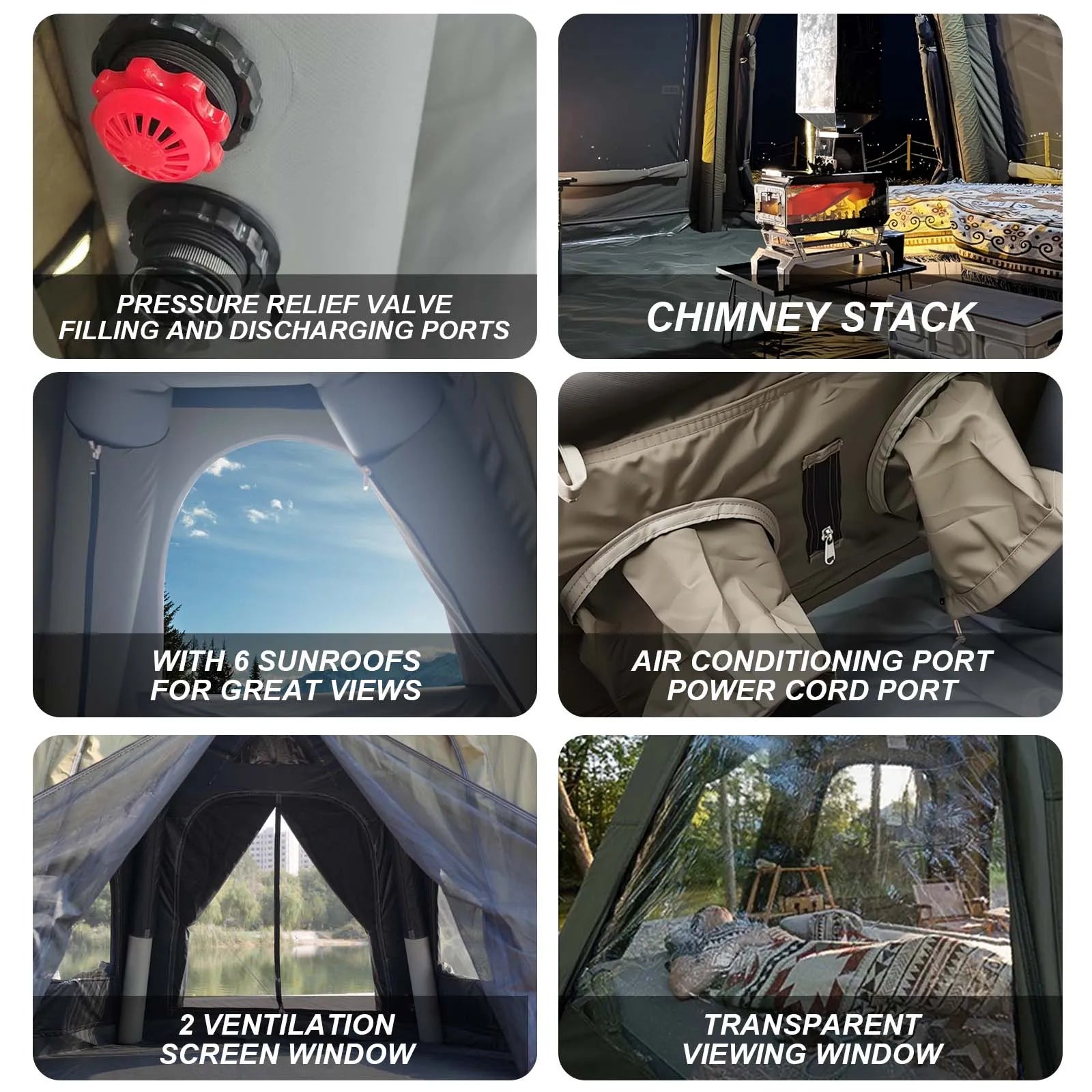 💡【Inflatable Tent House】6 Top Viewingskylights, AC Vents,Stove Jack 2 Doors with 4 Ventilation Mesh Window,Our inflatable tent For camping Have all the great features you'd find in Camping. What's more, we're giving you an extra oxford black - coated awning, which has excellent sun protection and shade effects, adding more comfort and convenience to your outdoor experience.Engineered for Every Scenario: All-Terrain Confidence.