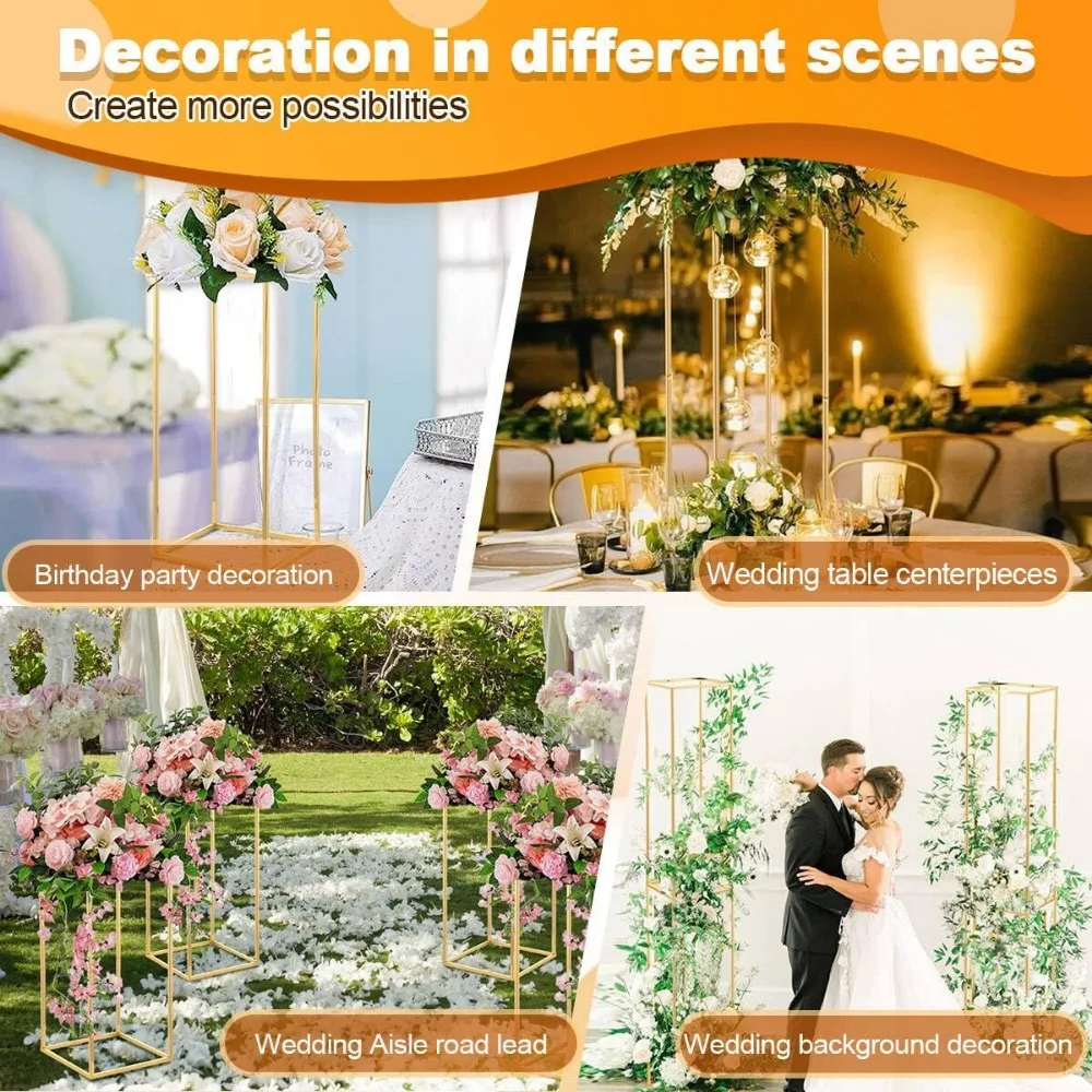 This wedding flower stand boasts a simple and elegant design, featuring a sleek rectangular structure and a sophisticated gold finish that adds a touch of luxury to any setting. Its versatile design makes it perfect for enhancing various home decor styles and is ideal for decorating wedding centerpieces, ceremonies, parties, and other special events. The timeless design ensures it complements any setting with elegance. Constructed from high-quality metal materials and enhanced by a premium electroplating process, this metal flower vase offers a brighter, more vibrant color and a smoother surface. The rectangular base provides exceptional stability and durability, preventing any wobbling or collapsing, even when fully decorated. It’s built to last and designed to impress. The upgraded wedding flower stand features two square frames at the top and bottom, connected by four durable metal rods for enhanced stability. A detailed instruction manual is provided for easy assembly. Despite its sturdy construction, the lightweight design allows for effortless disassembly and compact storage, saving space when not in use. Perfect for hassle-free setup and convenient storage! This set includes a beautifully designed wedding arch stand measuring 15.74 inches (40 cm) in height and 8.6 inches (21.8 cm) in width, along with 20 table centerpiece vases. The pieces feature a stunning blend of gold and rose gold tones, adding a touch of elegance to any setting. Please note that slight color variations may occur due to lighting and screen differences, making each piece uniquely special. Everything you need to create a cohesive and luxurious decor theme for your special event is right here! This gold centerpiece is perfect for creating stunning displays with flower balls, artificial flowers, or other decorative elements. Its iron geometric structure makes it an excellent choice for desktop decor, background frames, special event decorations, and even for enhancing spaces like bars, hotels, cafes, and living rooms. Whether it’s a wedding, party, or everyday decor, this piece adds a touch of sophistication. To maintain its luster, simply clean with a soft cloth and ensure it’s completely dry. If you have any questions about assembly or usage, feel free to reach out to us anytime. Elevate your decor with this metal flower vase and create unforgettable moments with its timeless charm!