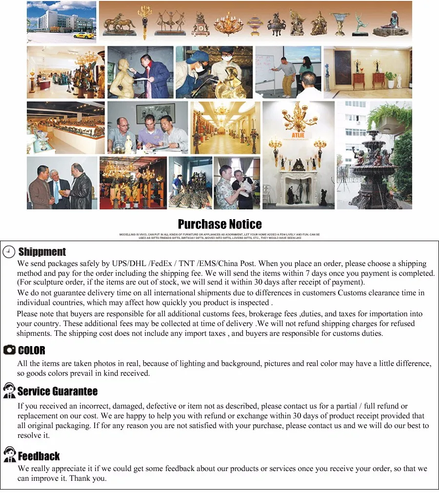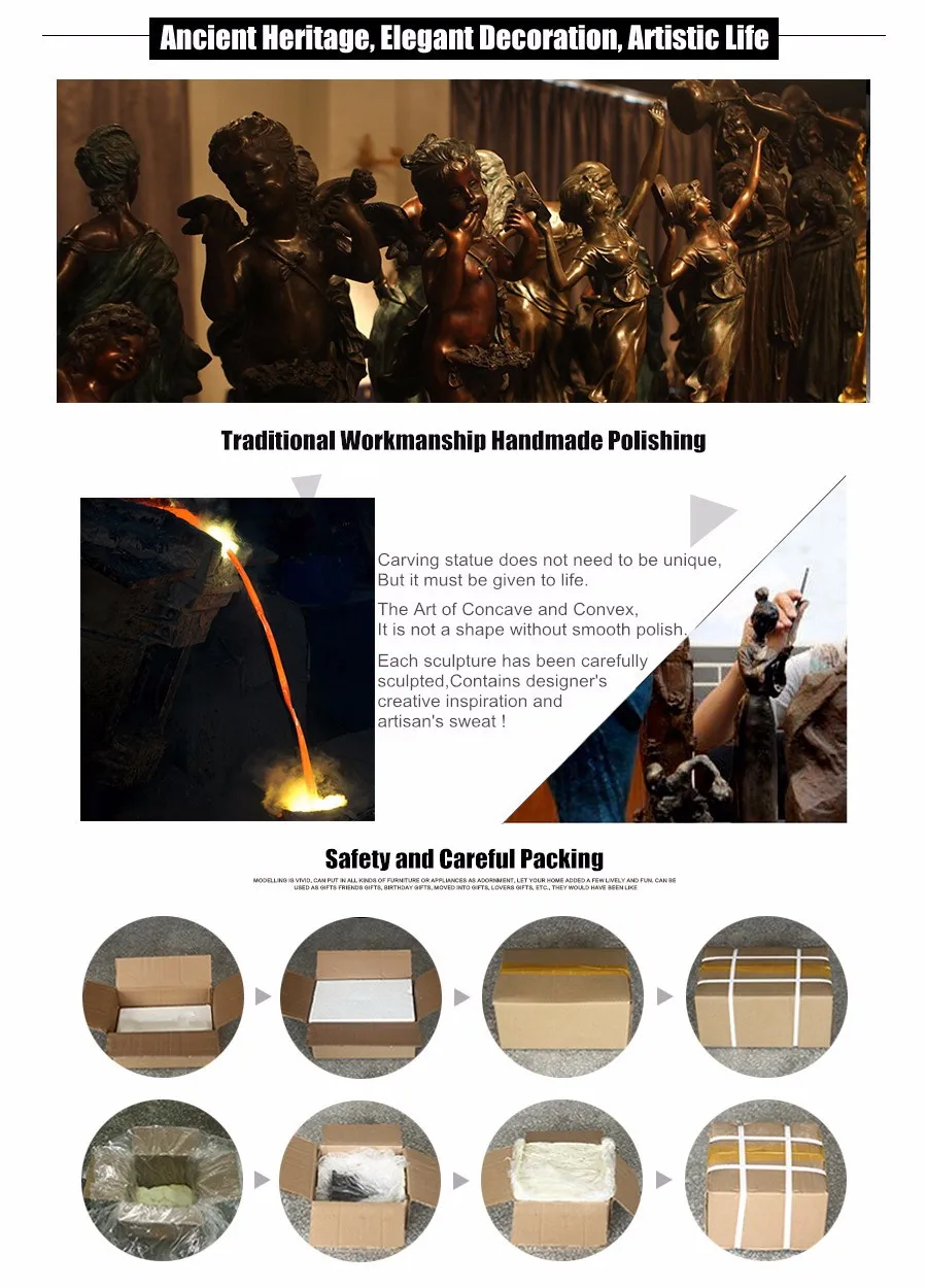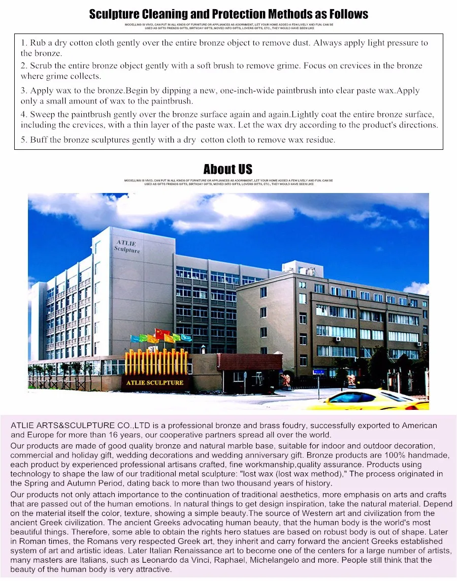 The sculpture is make of exclusive real bronze with marble base and highly accurate crafted with attention to the smallest details.The fine detail, the lifelike features are all very vivid and realistic in this works. Gorgeous ornament display atop any shelf, cabinet or table in home, living room or office, also wonderful gift for family and friend.