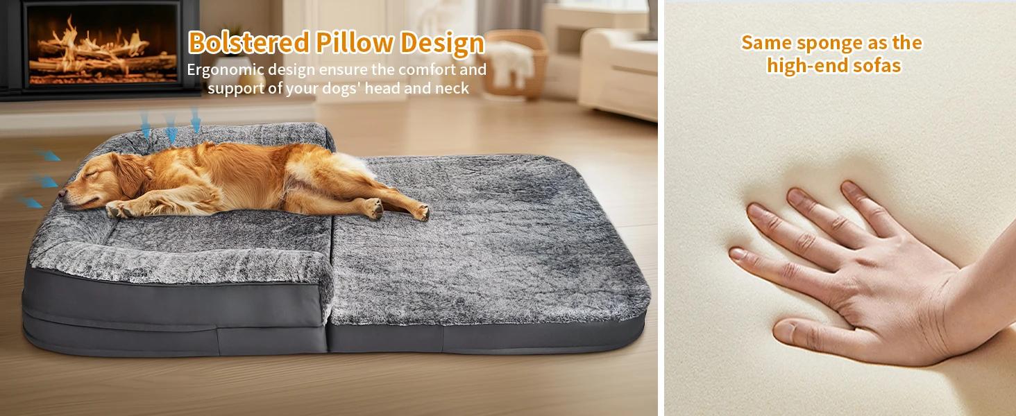 Supportive Sponge & Plush Bolster : Incorporating a high-density flat sponge foam base that remains highly durable and anti-deformation, with a thickness of 10cm,hold its shape over time, providing excellent support for joints and muscles, distributes the weight evenly across the surface, the sponge doesn’t sag, greater value than egg crate foam, helps relieves fatigue and eases the pressure on joints, also built-in three-sided plush pillow bolster, gently cradles dogs’ head and neck for a deep, restful nap