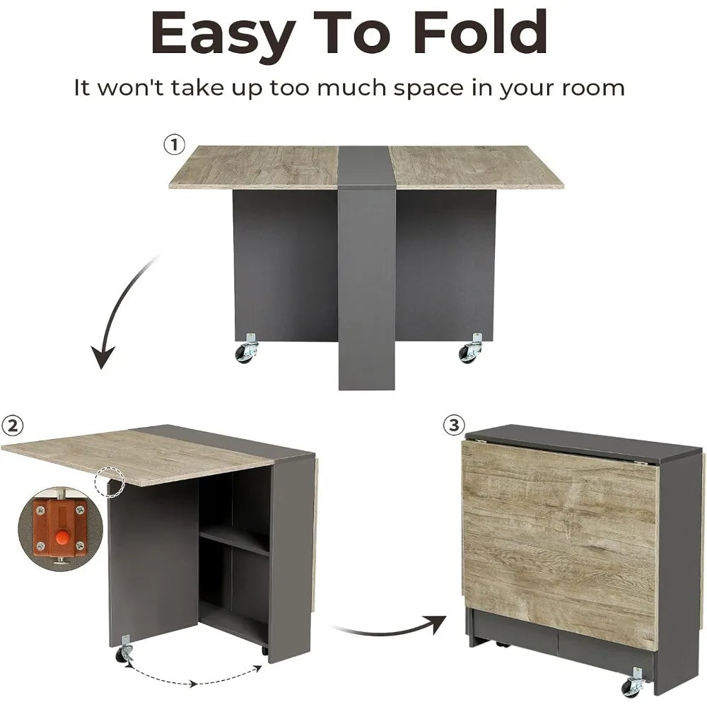 Folding Dining Table, Drop Leaf Dining Table with Wheels and Layer Storage Shelf, Space Saving Dining Table for Small Spaces