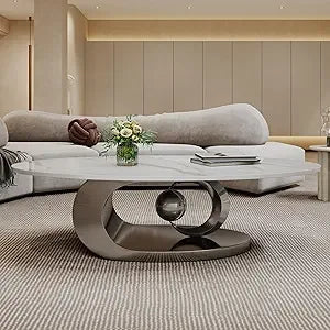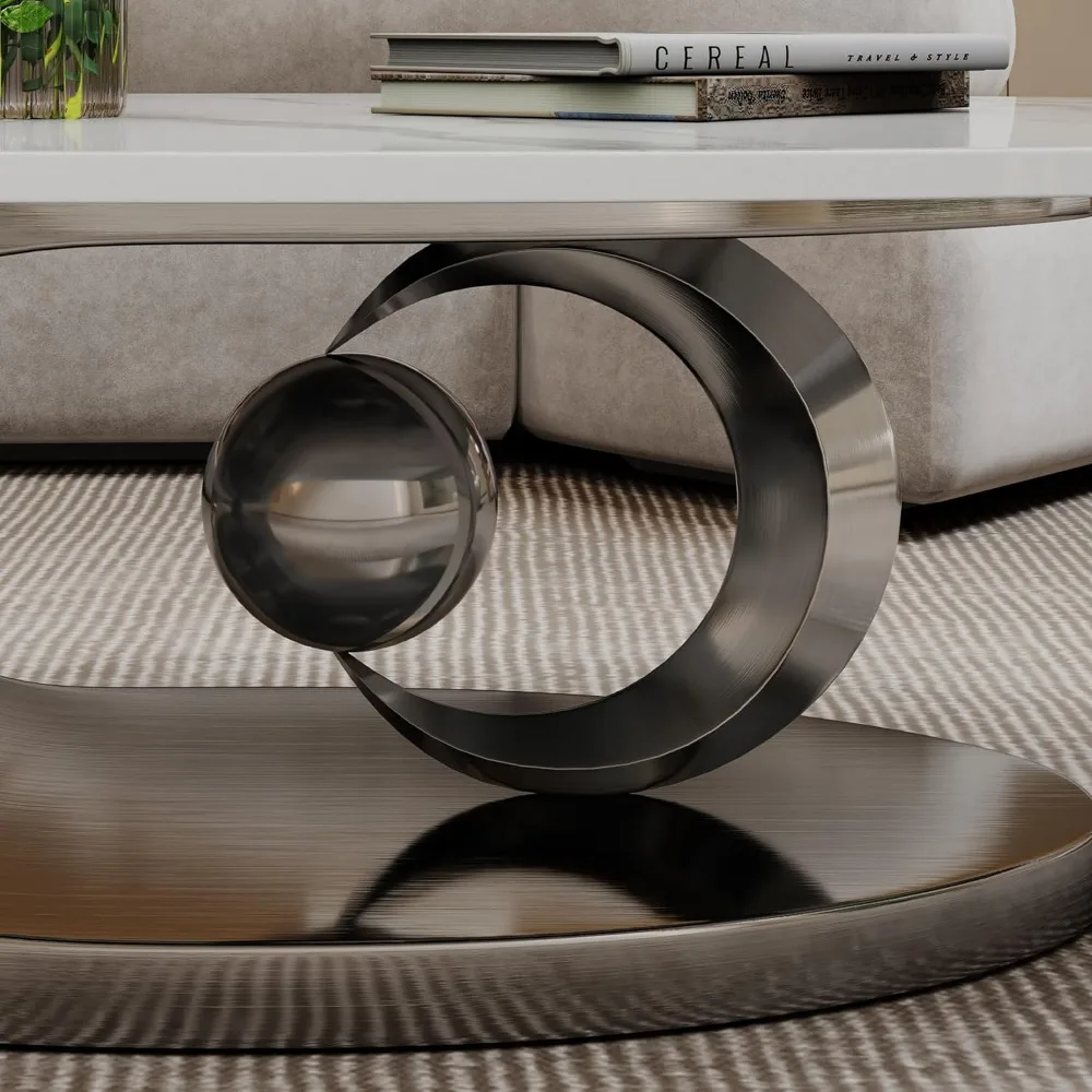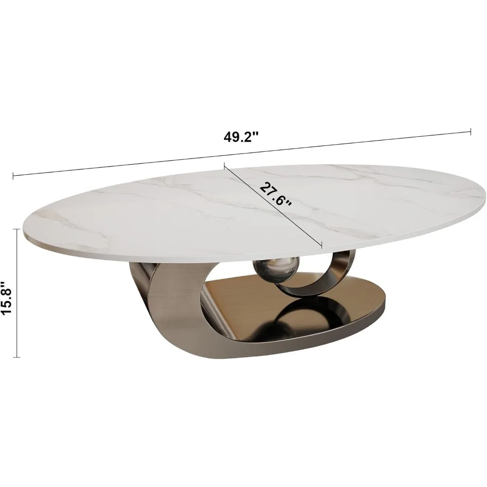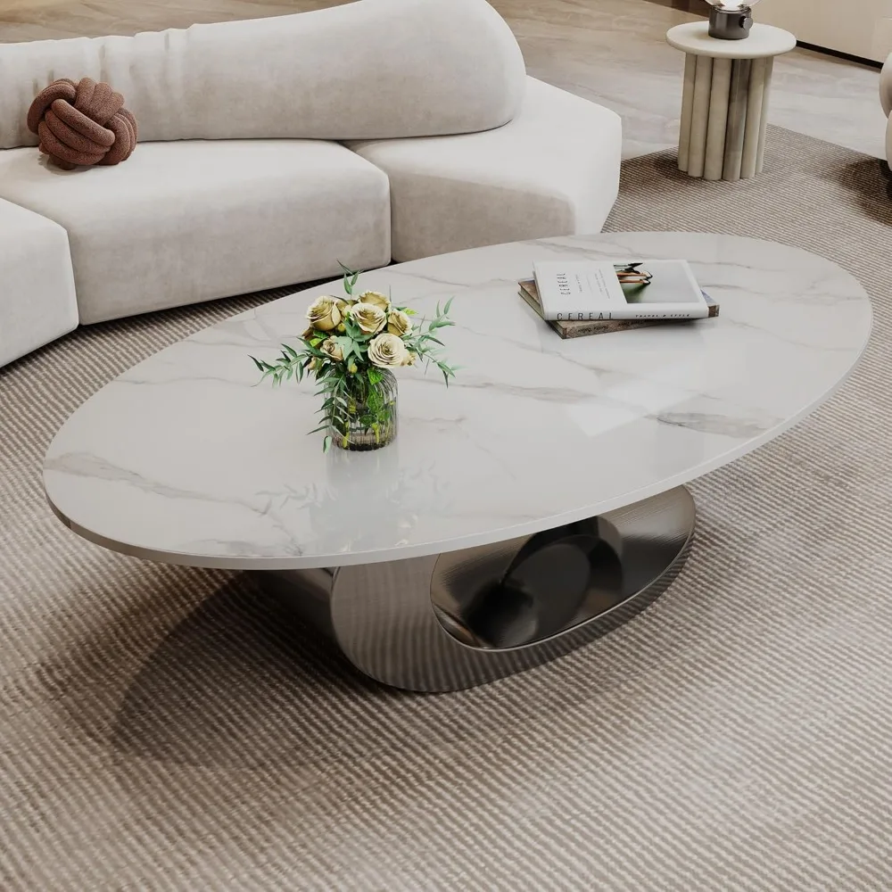 Oval Coffee Table for Living Room, Modern Center Table with Faux Marble Tabletop and Sculptural Stainless Steel Base, Silver+Whi