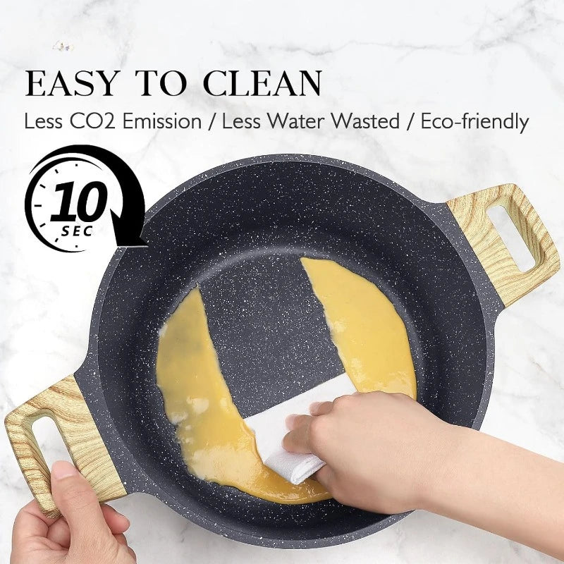 - Super Non-stick & Effortless Cleaning - Our non stick pots and pan set has a ultra smooth and highly non-stick surface that allows eggs to slide off the frying pan effortlessly with nothing sticks. Making your cleaning a breeze, just wipe with paper towels or rinse with water, less CO2 emissions and less water waste. Dishwasher safe, not for use in ovens