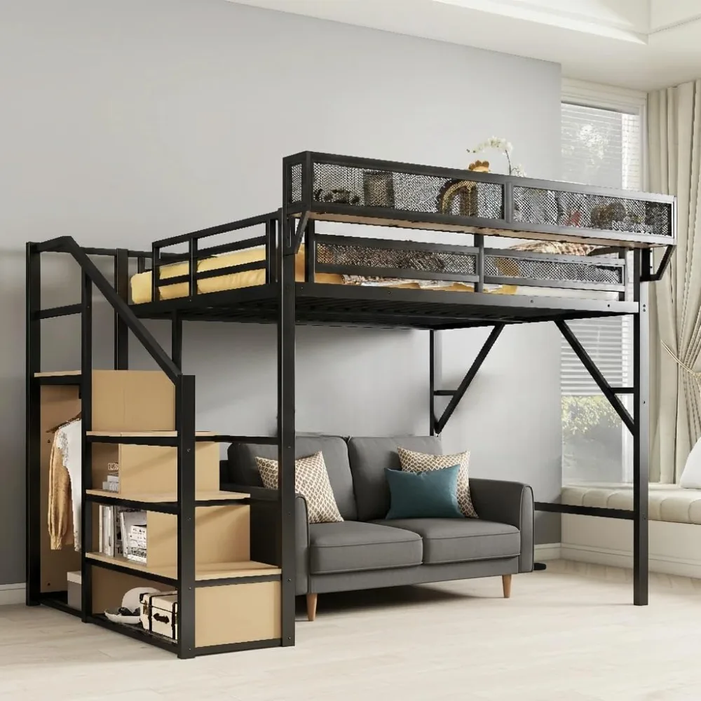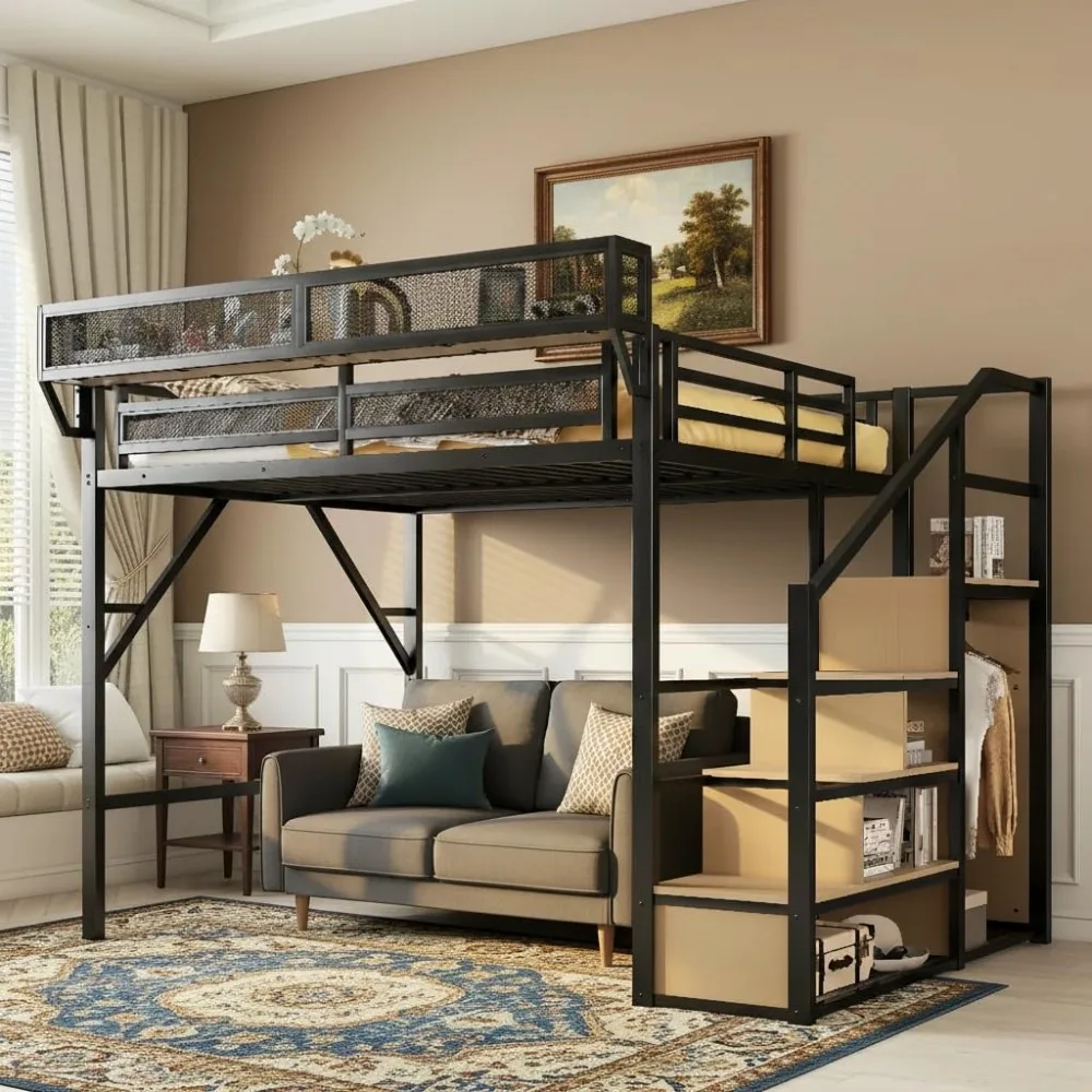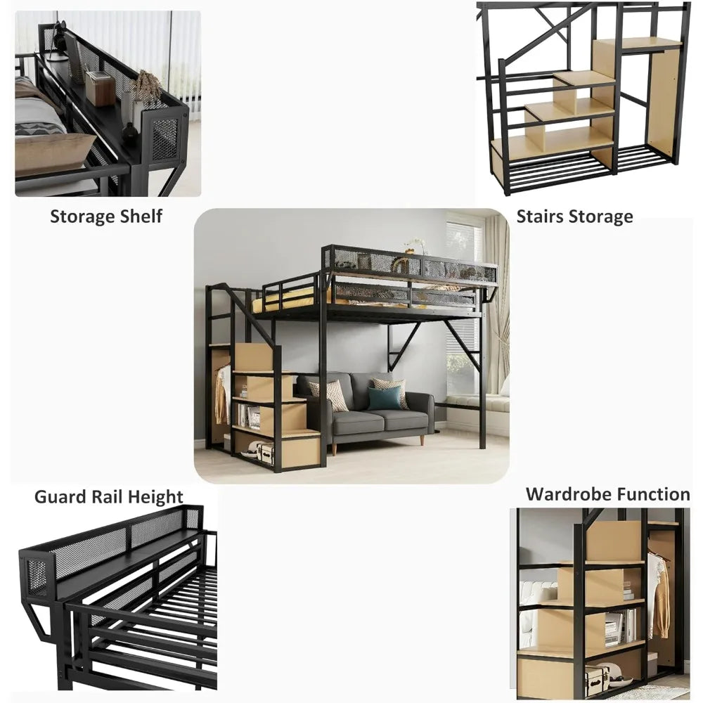 Queen Size Loft Bed with Stairs and Wardrobe, Black Metal Bed Frame with Shelves & Under-Bed Storage, (Black, Queen)