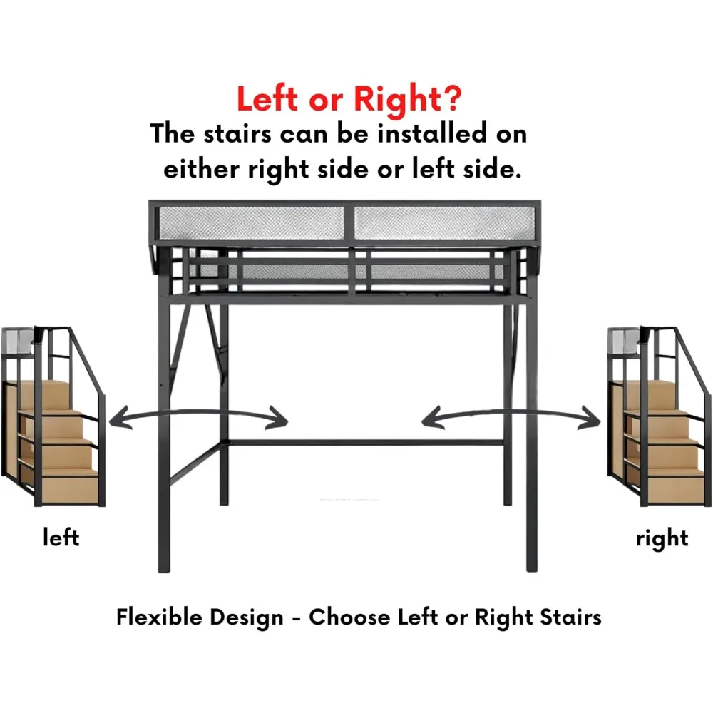Spacious Queen Loft Bed – Designed for teens and adults, this queen size loft bed provides extra room while maximizing floor space. Wardrobe Staircase Storage – Wide staircase includes built-in wardrobe and storage compartments for clothes, shoes, or accessories. Convenient Side Shelf – Mesh-guarded shelf keeps books, gadgets, or décor within reach, enhancing both function and safety. Flexible Layout – Reversible stairs can be installed on either left or right side, fitting seamlessly into any room layout. Heavy Duty Metal Frame – Made from black metal, supports up to 400 lbs. Strong, durable, and sleek design fits modern homes.