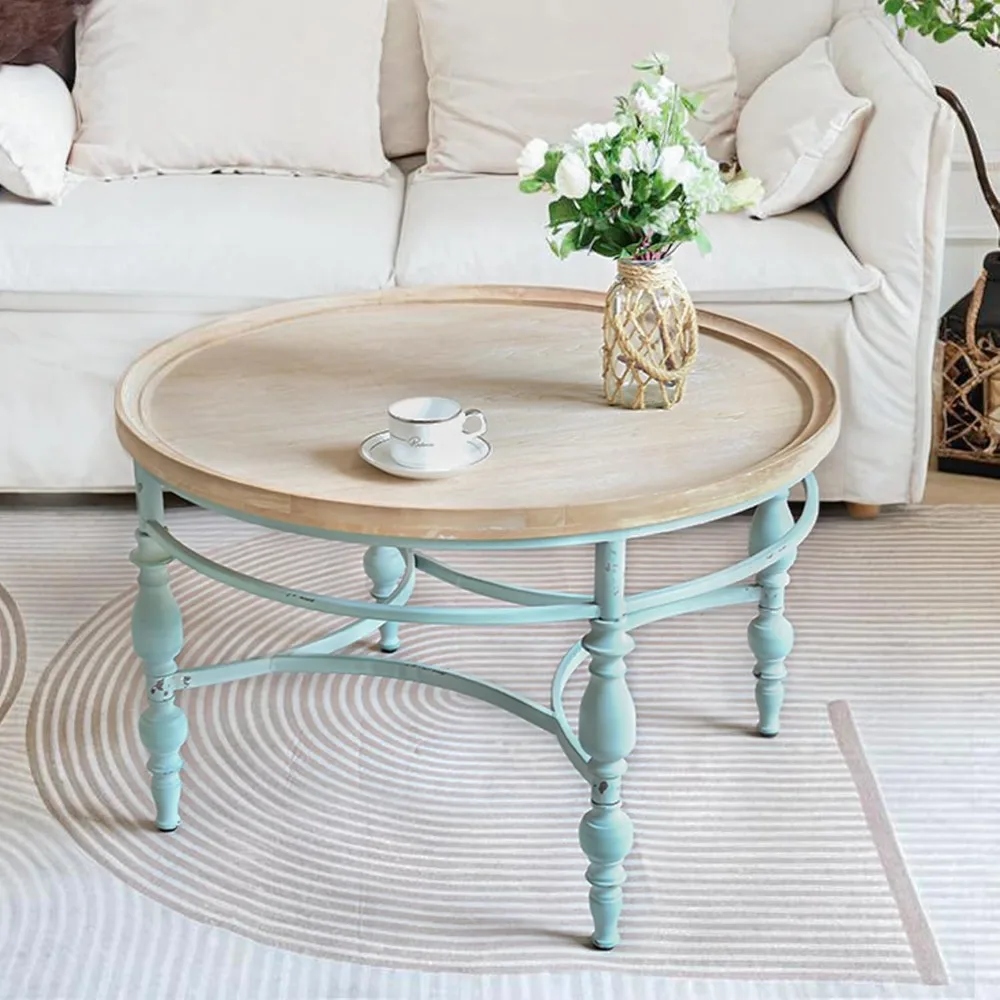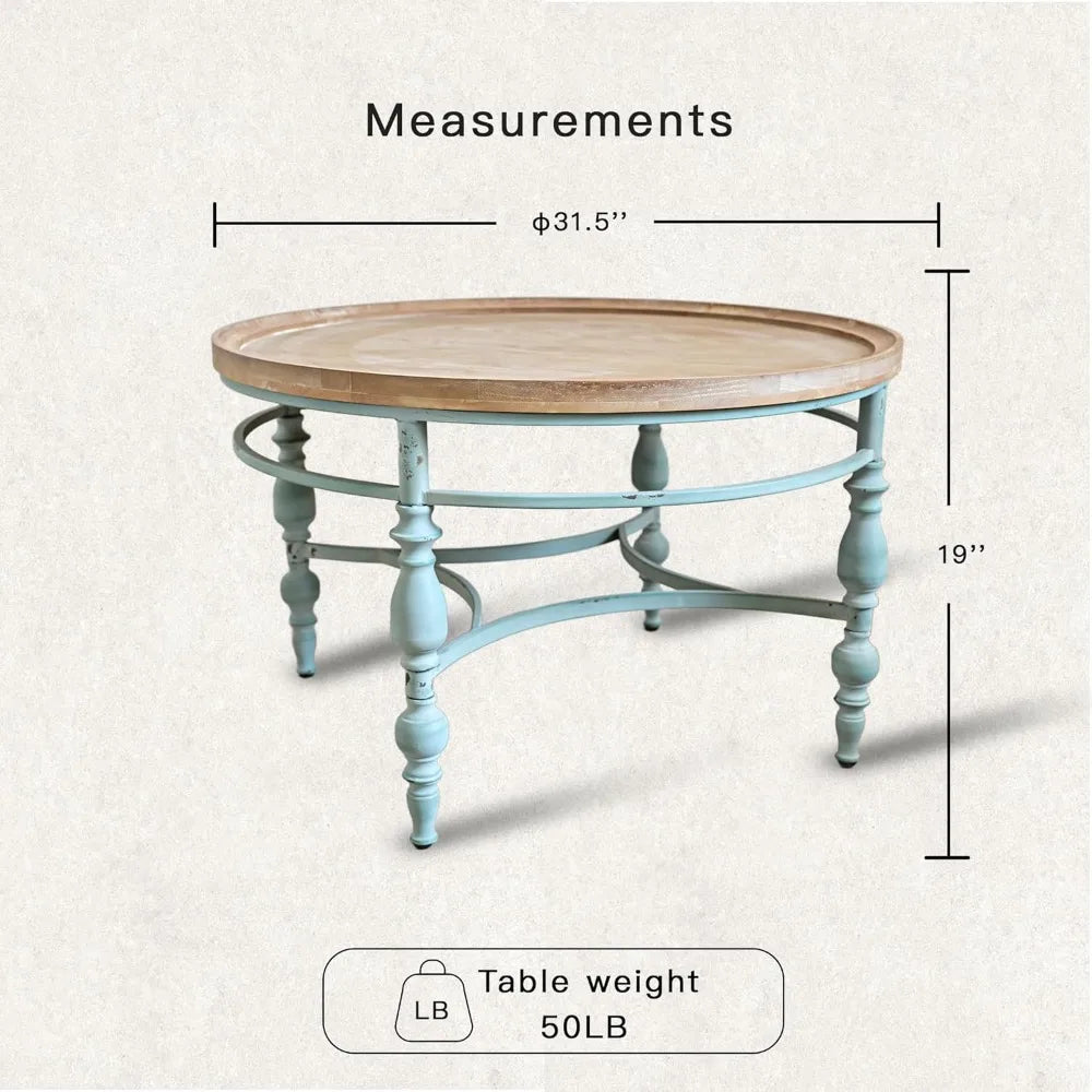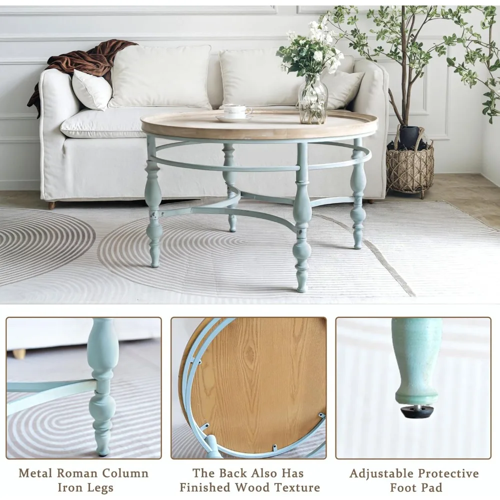 Rustic Farmhouse Round Coffee Table, French Country Vintage Center Table,φ31.5'' x18.9''H Rustic Solid Wood with Vintage Iron Le